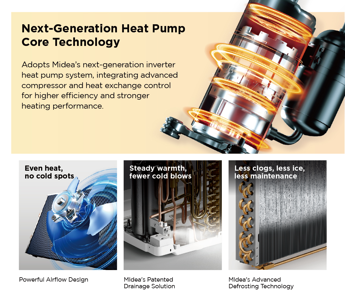 The Midea Packaged Terminal Heat Pump delivers 100% heating at 5°F with COP of 2.0, eliminates electric resistance backup, and simplifies installation with its compact all-in-one design — achieving up to 75% energy savings compared to traditional fixed-speed PTAC units.